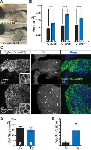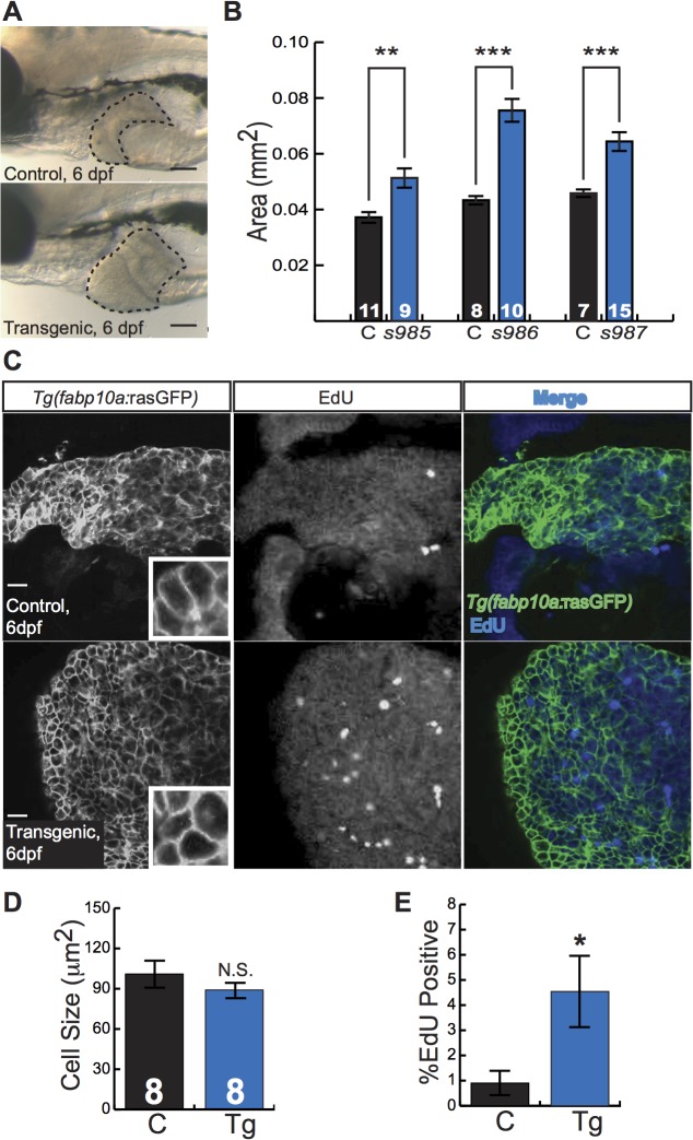 Fig 3. Activated β-catenin causes larval liver enlargement and increased hepatocyte proliferation.(A) Brightfield images of control sibling and transgenic 6-day-old fixed larvae. Livers are outlined. Scale bars, 100 μm. (B) Graph showing average liver size ± SEM of 6-day-old larvae from three different transgenic lines (s985, s986, s987) compared to control siblings (C). N values are shown above the x-axis. Asterisks indicate p-values for 2-way ANOVA comparing transgenic zebrafish to control siblings in the same experiment: **, p<0.01; ***, p<0.001. (C) Immunofluorescence images of 6-day-old control and transgenic larvae, highlighting hepatocyte cell membranes (Tg(fabp10a:rasGFP)) and proliferating cells (EdU). Scale bars, 20 μm. Inset photos are 4X magnifications. (D-E) Graphs showing average cell size ± SEM (D) and percent of hepatocytes that were EdU positive (E). N values, which are the same for both graphs, appear above the x-axis in D; samples were compared using the Studentâs t-test. *, p<0.05. |