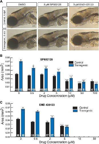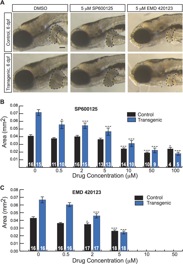 Fig 4. JNK inhibitors suppress larval liver enlargement caused by activated β-catenin.(A) Brightfield images of control sibling and transgenic 6-day-old fixed larvae, treated with DMSO or JNK inhibitors. Livers are outlined. Scale bar, 100 μm. (B-C) Graphs showing average liver size ± SEM of 6-day-old control sibling and transgenic larvae treated for 3 days with SP600125 (B) or EMD 420123 (C) at the indicated dosages. N values are shown above the x-axis. Asterisks indicate p-values for 2-way ANOVA comparing drug-treated zebrafish to DMSO-treated siblings with the same genotype: *, p<0.05; ***, p<0.001. |