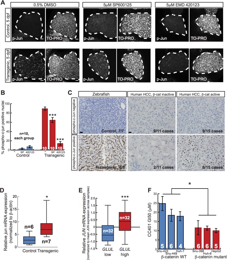 Fig 5. Activated β-catenin is associated with JNK pathway activation.(A) Representative whole-mount immunofluorescence images and (B) quantification of 5-day-old control sibling and transgenic larvae treated for 2 days with 0.5% DMSO alone, 5 μM SP600125, or 5 μM EMD 420123 and stained with antibodies against phospho-c-Jun (left panels) and TO-PRO nuclear stain (right panels). Livers are outlined in white. Scale bar, 20 μm. N values are shown above the x-axis. Drug-treated zebrafish were compared to DMSO-treated siblings with the same genotype using 2-way ANOVA. ***, p<0.001. (C) Representative photographs of zebrafish control and Tg(fabp10a:pt-β-cat) livers (left) and human HCC without (middle) and with (right) activated β-catenin, stained with anti-phospho-c-Jun antibodies. For zebrafish, 6 out of 8 (75%) Tg(fabp10a:pt-β-cat) livers with HCC contained one or more foci with moderate or high nuclear phospho-c-Jun staining (phospho-c-Jun positive), while all non-transgenic control livers (N = 7) without activated β-catenin showed absent or low staining (phospho-c-Jun negative). For human HCC, the number of cases exhibiting each staining pattern and the total number of cases with a given β-catenin activation status are shown at the bottom right of each picture. Images counterstained with hematoxylin. Scale bars, 20 μm. (D) Normalized jun mRNA expression in control sibling and transgenic adult zebrafish livers. Three technical replicates were performed for each sample. *, p<0.05, Mann-Whitney test. N values are shown above the x-axis. (E) Normalized JUN mRNA expression for human HCC with low GLUL and high GLUL expression. ***, p<0.001, Mann-Whitney test. (F) Graph showing dose of JNK inhibitor CC401 at which cell viability of human cancer cell lines was decreased by 50% (GI50), ± SEM. Number of replicates for each cell line is shown above the x-axis. *, p<0.05, unpaired t-test. |