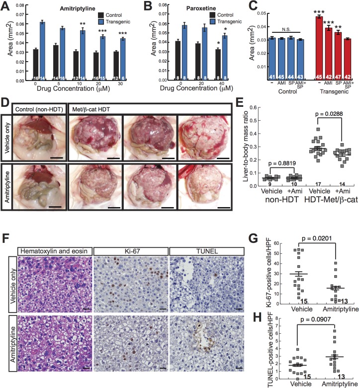 Fig 6. Antidepressants decrease β-catenin-induced liver enlargement and tumorigenesis.(A-B) Graphs showing mean liver size ± SEM of 6-day-old control sibling and transgenic zebrafish larvae treated for 3 days with amitriptyline (A) or paroxetine (B) at the indicated dosages. N values are shown above the x-axis. Asterisks indicate p-values for 2-way ANOVA comparing drug-treated zebrafish to DMSO-treated siblings with the same genotype: *, p<0.05; **, p<0.01; ***, p<0.001. (C) Graph showing mean liver size ± SEM of 6-day-old control sibling and transgenic zebrafish larvae treated for 3 days with 0.5% DMSO (-), 20 μM amitriptyline (AMI), 2 μM SP600125 (SP), or both drugs combined (AMI+SP). N values are shown above the x-axis. Asterisks indicate p-values for 2-way ANOVA comparing each group of transgenic zebrafish to AMI+SP group: **, p<0.01; ***, p<0.001. N.S., no significant difference between groups of non-transgenic zebrafish (2-way ANOVA). (D) Representative images of control, non-hydrodynamically transfected (non-HDT) mouse livers (left) and mouse liver tumors induced by hydrodynamic transfection of activated β-catenin and Met (Met/β-cat HDT). Mice were treated with saccharine alone (vehicle only, top row) or amitriptyline plus saccharine (bottom row). Scale bars, 1 cm. (E) Graph showing mean liver-to-body mass ratios ± SEM for non-HDT and HDT-Met/β-cat mice treated with saccharine alone (vehicle) or amitriptyline plus saccharine (+Ami). P values calculated with Mann-Whitney test. N values are shown above the x-axis. (F) Representative hematoxylin-and-eosin-stained, Ki-67-labeled, and TUNEL-labeled images from vehicle- and amitriptyline-treated mice. Ki-67 and TUNEL stainings were performed using 3, 3'-diaminobenzidine (DAB) substrate, so positive-staining cells are brown, and hematoxylin counterstain to highlight nuclei and other basophilic structures in blue. (G-H) Graphs showing mean ± SEM of Ki-67-positive (G) or TUNEL-positive (H) cells per high-power field. P values calculated with Mann-Whitney test. N values are shown above the x-axis. |