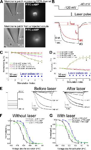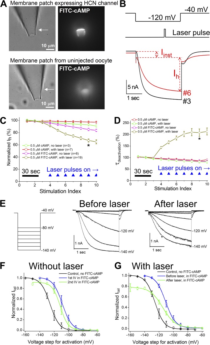 Figure 1. Effects on Ih current by photodynamic transformation. (A) Bright field (left) and fluorescence (right) images of a membrane patch expressing mHCN2 channels. Bottom pictures show a membrane patch from an uninjected cell. 0.5 µM FITC-cAMP was applied to the bath. (B; top) The voltage protocol for channel activation and the timing of 100-msec laser pulse. (Bottom) Representative current traces before (no. 3 in C) and after the application of laser pulses (nos. 6 and 9 in C). (C) Normalized Ih amplitude versus stimulation index. Voltage step was delivered every 15 s. (D) Normalized time constant of deactivation. *, P < 0.05 in C and D. (E; left) The voltage protocol for collecting I-V curve. (Middle) Current traces before the laser treatment. (Right) Current traces after the laser treatment. (F) I-V curves without laser treatment. The V1/2 values are −126.7 ± 3.2 mV (n = 8; control without cAMP), −109.4 ± 2.6 mV (first I-V in 0.5 µM FITC-cAMP), and −112.5 ± 2.4 mV (second I-V in 0.5 µM FITC-cAMP). The averaged shift in V1/2 is −3.1 ± 1.7 mV (n = 7) and not significant (one-way repeated measures ANOVA). (G) I-V curve with laser treatment. The V1/2 values are −114.6 ± 1.6 mV (I-V in 0.5 µM FITC-cAMP before laser) and −120.4 ± 1.2 mV (I-V in 0.5 µM FITC-cAMP after laser treatments). The averaged shift in V1/2 is −5.8 ± 0.8 mV (n = 6) and significant.