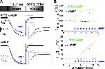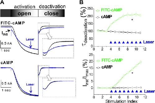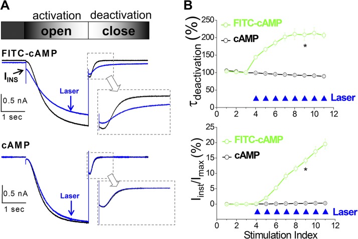 Figure 2. Photodynamic transformation slows down channel deactivation and enhances voltage-insensitive Iinst. (A) Current traces before (black; no. 3 in B) and after (blue; no. 7 in B) laser treatments. Arrow indicates Iinst. Gray arrows point out close-up view over the current traces during channel deactivation. (B) Percentage of Iinst (top) or time constant of channel deactivation (bottom) versus episode number. Laser pulses (filled blue triangle) were given every 15 s after the third episode. FITC-cAMP, n = 19; cAMP, n = 7. *, P < 0.05.