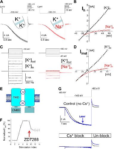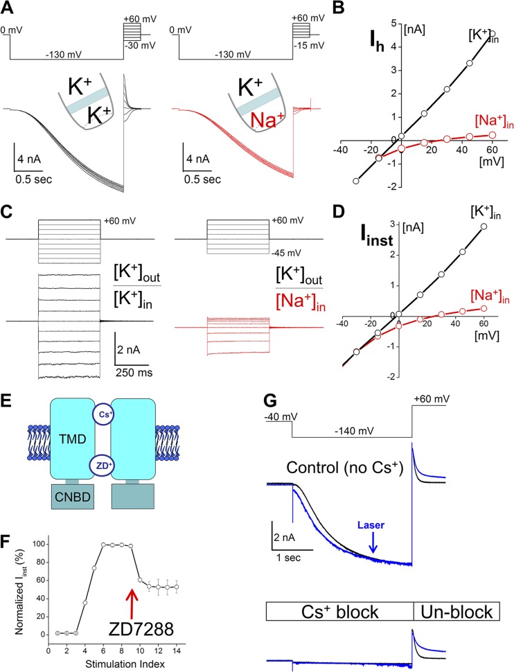 Figure 3. Photochemically generated Iinst has key biophysical features of canonical HCN channel. (A) Voltage protocol (top) and current traces for measuring pK+/pNa+ of Ih current. (B) I-V curves of Ih current. (C) Voltage protocols (top) and current traces of Iinst. (D) I-V curves of Iinst. (E) ZD7288 and Cs+ interact with different regions in the HCN pore. (F) Iinst was generated by applying laser pulses (nos. 3–5). 60 µM ZD7288 was added to the bath solution after number 9. (G) 2 mM Cs+ was added to the pipette solution. A voltage step to +60 mV released the Cs+ block. Current traces: black, control; blue, after three laser pulses. Current traces in A–C were measured in the absence of ligands (cAMP or FITC-cAMP). 0.5 µM FITC-cAMP was present in F and G.