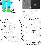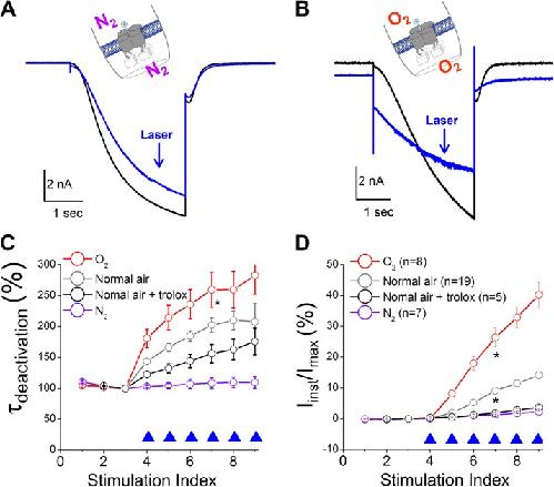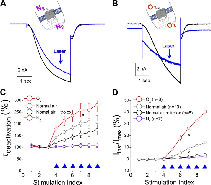 Figure 4. Photochemical transformation of the HCN channel is oxygen dependent. Solutions used in the experiments were degassed and then purged with pure N2 or O2. (A and B) Current traces before (black; no. 3 in C and D) and after laser pulses (blue; no. 8 in C and D). *, the group of O2 is significantly different from the data groups of Normal air + trolox and N2 (one-way ANOVA). (C and D) τdeactivation or percentage of Iinst versus episode number. 0.5 µM FITC-cAMP was applied to the bath solution. *, the groups of O2 and normal air are significantly different from the other two data groups.