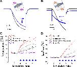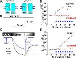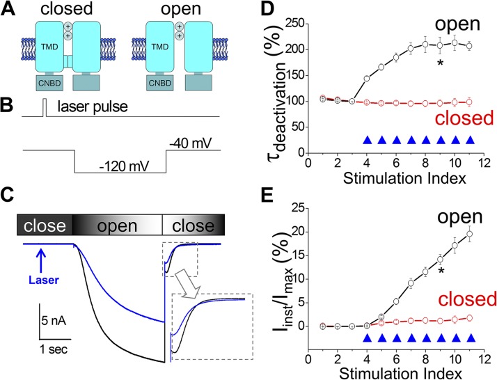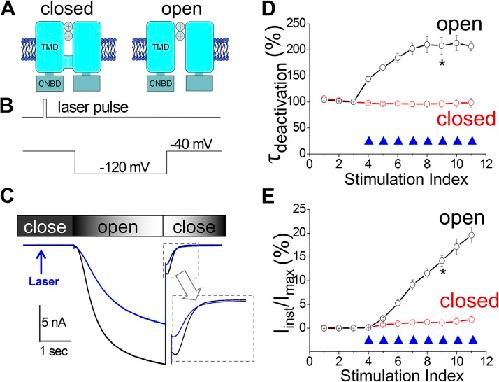Figure 6. 1O2 modification of the mHCN2 channel is state dependent. (A) Schematic drawings of closed and open channels. (B) Laser pulses were delivered preceding the hyperpolarization step. (C) Current traces before (black; no. 3 in D and E) and after (blue; no. 7 in D and E) laser treatments. (D and E) Normalized τdeactivation or percentage of Iinst versus episode number. 0.5 µM FITC-cAMP was applied to the bath. *, P < 0.05.