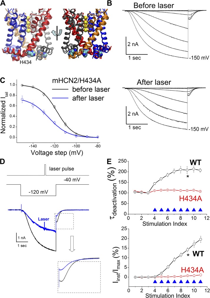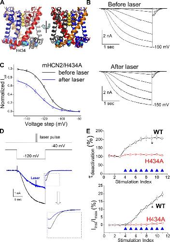 Figure 7. H434 is critical for 1O2 modification of the mHCN2 channel. (A) Structure model of the mHCN2 pore (based on Kv1.2-2.1 chimeric structure) (Long et al., 2007). (B) Current traces of mHCN2/H434A mutant channel in the presence of 0.5 µM FITC-cAMP. A series of hyperpolarizing voltage steps in a −10-mV interval was used to activate Ih. (C) I-V curves of mHCN2/H434A before (black) and after (blue) laser treatment. Current amplitudes were normalized to the maximal level before laser treatment. V1/2 values (with laser treatment) are −121.4 ± 1.7 mV (before laser in FITC-cAMP) and −129.7 ± 1.3 mV (after laser). The corresponding ΔV1/2 is −8.3 ± 2.0 mV (n = 7) and significant (one-way repeated measures ANOVA). As a control, the V1/2 values in the presence of FITC-cAMP but without laser treatment are −119.6 ± 3.3 mV (first I-V) and −128.2 ± 4.1 mV (second I-V). The ΔV1/2 is −8.5 ± 1.6 mV (n = 8; significant). (D; top) Laser pulse. (Middle) Voltage protocol. (Bottom) Current traces before (black; no. 3 in D and E) and after (blue; no. 7 in D and E) laser treatments. (E) Normalized τdeactivation or percentage of Iinst versus episode number. WT, n = 19; mHCN2/H434A, n = 13. *, P < 0.05.