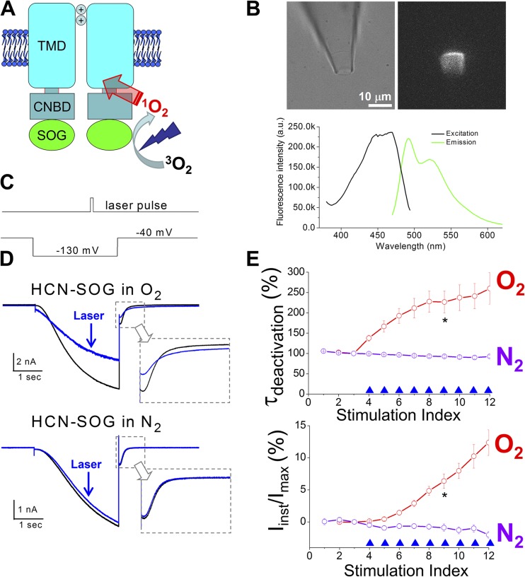 Figure 5. 1O2 mediates photochemical transformation of the mHCN2 channel. (A) Construction of the HCN2-SOG fusion channel. (B; top) Bright field and fluorescence images of a membrane patch expressing HCN2-SOG channels. (Bottom) Excitation and emission spectra of purified mini-SOG protein. (C) Timing of the laser pulse and the voltage protocol. (D) Current traces before (black; no. 3 in E) and after (blue; no. 7 in E) laser treatments. (E) τdeactivation or percentage of Iinst versus episode number. Neither cAMP nor FITC-cAMP was applied. *, P < 0.05.