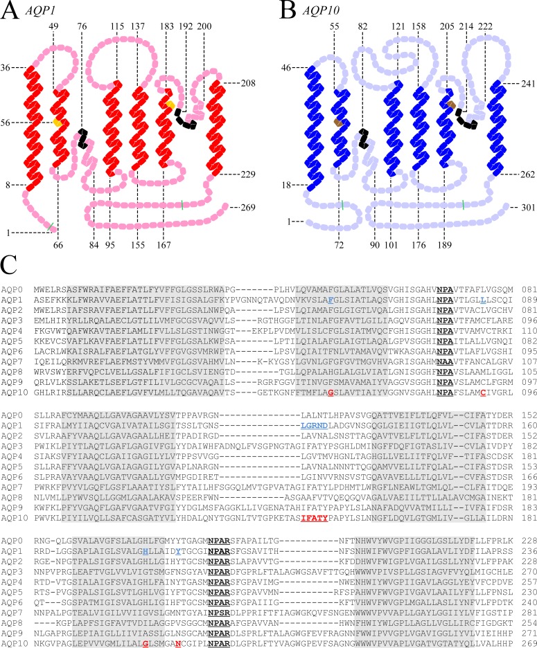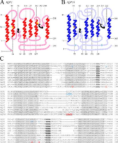 Figure 1. Hydropathy plot models and transport characteristics of wild-type AQP1 and AQP10. (A) Model of AQP1. Each symbol corresponds to a single residue within a transmembrane domain (red), a connecting segment (pink), the XX/R filter (yellow), or the NPA motifs (black). Residues above the transmembrane domains face the extracellular side of the membrane. The cartoon was drawn with the program PLOT based on the hydropathy model of Murata et al. (2000). (B) Model of AQP10. Each symbol corresponds to a single residue in a transmembrane domain (blue), a connecting segment (pale blue), the XX/R filter (brown), or the NPA motifs (black). The cartoon was drawn with the program PLOT based on sequence alignments of transmembrane domains with AQP1. (C) Multiple alignment analysis of AQP family members with Clustal Omega. The residue segment used for each of the channels corresponds to the one that is flanked by green lines in A and B; the N and C termini were excluded from the analysis given that they are poorly conserved among the isoforms. AQP11 and AQP12 were also excluded given that they share much lower homologies with the other family members. Gray boxes correspond to transmembrane segments based on alignments with AQP1, and colored residues correspond to those that were interchanged between AQP1 and AQP10 in this study.