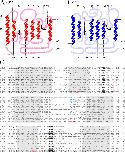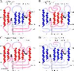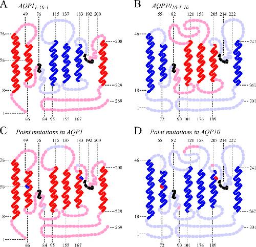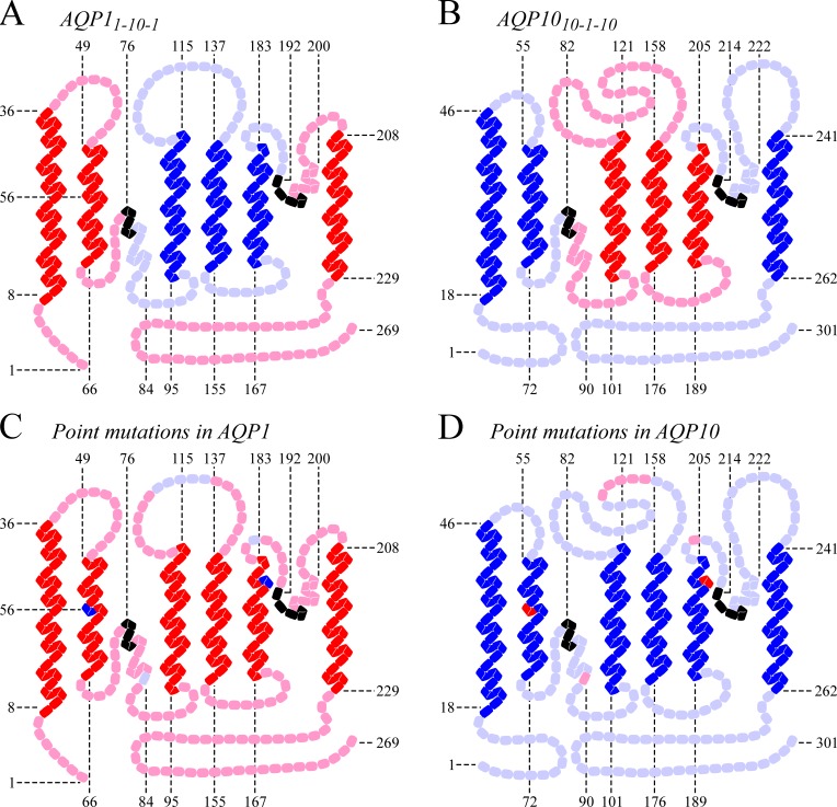Figure 2. Location of residues that were substituted in AQP1 and AQP10. The cartons were drawn as described in Fig. 1 using the same color code. (A and B) Chimeras. (C and D) Point substitutions.