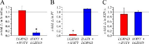 Figure 5. Transport characteristics and membrane expression of AQP1LGRND→IFATY and AQP10IFATY→LGRND. Experimental conditions were as described in Fig. 4. Data expression is also as described in Fig. 4. (A) Si influx. Data are expressed as means ± SE of 10 oocytes among three experiments. (B) Water permeability. Data are expressed as means ± SE of three to five oocytes among three to four experiments. (A and B) The asterisk is used to indicate that the mean is significantly different statistically (*, P < 0.05) compared with the wild-type channel. (C) AQP expression at the cell surface (EXPcs). Data are expressed as means ± SE among three to four experiments.