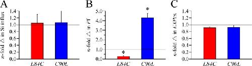 Figure 6. Transport characteristics and membrane expression of AQP1L84C and AQP10C90L. Experimental conditions were as described in Fig. 4. Data expression is also as described in Fig. 4. (A) Si influx. Data are expressed as means ± SE of 10 oocytes among three to six experiments. (B) Water permeability. Data are expressed as means ± SE of three to five oocytes among three to four experiments. (B) The asterisk is used to indicate that the mean is significantly different statistically (*, P < 0.05) compared with the wild-type channel. (C) AQP expression at the cell surface (EXPcs). Data are expressed as means ± SE among three to four experiments.