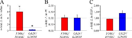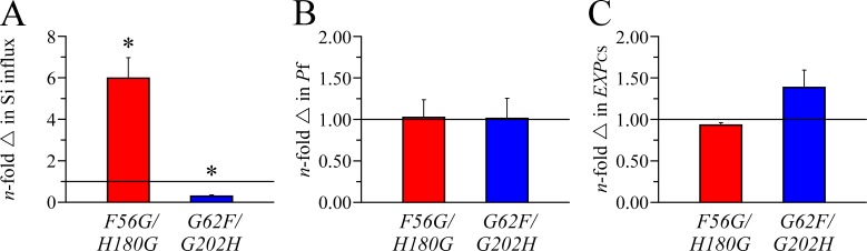 Figure 8. Transport characteristics and membrane expression of AQP1F56G/H180G and AQP10G62F/G202H. Experimental conditions were as described in Fig. 4. Data expression is also as described in Fig. 4. (A) Si influx. Data are expressed as means ± SE of 10 oocytes among eight to nine experiments. The asterisk is used to indicate that the mean is significantly different statistically (*, P < 0.05) compared with the wild-type channel. (B) Water permeability. Data are expressed as means ± SE of three to five oocytes among four to five experiments. (C) AQP expression at the cell surface (EXPcs). Data are expressed as means ± SE among three to four experiments.
