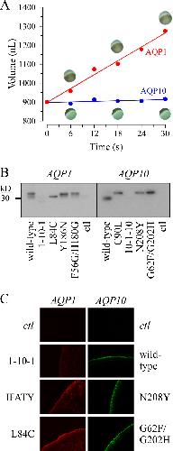 Figure 9. Illustrative experiments. (A) Water transport. After incubation in plain water, an oocyte expressing AQP1 and an oocyte expressing AQP10 were microphotographed at different time points for cell volume measurements. (B) Expression of wild-type and mutant AQPs by Western blot analyses. Samples correspond to cell surface proteins detected with an anti-AQP1 Ab (left) or an anti-AQP10 Ab (right). In each panel, water-injected oocytes were used as negative controls. (C) Immunofluorescence experiments. Cryosections postfixed in paraformaldehyde were obtained from AQP-expressing oocytes after a 3-d incubation in medium B1 at 18°C. Wild-type and mutant AQPs were detected with an anti-AQP1 Ab (left) or an anti-AQP10 Ab (right). For each Ab, water-injected oocytes were used as negative controls. Micrographs were taken under confocal microscopy and are shown in the panel for some of the AQPs: (top left) water, (second left) AQP11-10-1, (third left) AQP1LGRND→IFATY, (bottom left) AQP1L84C, (top right) water, (second right) wild-type AQP10, (third right) AQP10N208Y, and (bottom right) AQP10G62F/G202H. Note that each of the micrographs is ~300 μm in actual width.