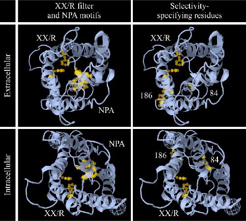 We recently demonstrated that the aquaglyceroporins (AQGPs) could act as potent transporters for orthosilicic acid (H4SiO4). Although interesting, this finding raised the question of whether water and H4SiO4, the transportable form of Si, permeate AQGPs by interacting with the same region of the pore, especially in view of the difference in molecular radius between the two substrates. Here, our goal was to identify residues that endow the AQGPs with the ability to facilitate Si diffusion by examining the transport characteristics of mutants in which residues were interchanged between a water-permeable but Si-impermeable channel (aquaporin 1 [AQP1]) and a Si-permeable but water-impermeable channel (AQP10). Our results indicate that the composition of the arginine filter (XX/R), known to include three residues that play an important role in water transport, may also be involved in Si selectivity. Interchanging the identities of the nonarginine residues within this filter causes Si transport to increase by approximately sevenfold in AQP1 and to decrease by approximately threefold in AQP10, whereas water transport and channel expression remain unaffected. Our results further indicate that two additional residues in the AQP arginine filter may be involved in substrate selectivity: replacing one of the residues has a profound effect on water permeability, and replacing the other has a profound effect on Si permeability. This study has thus led to the identification of residues that could play a key role in Si transport by the AQGPs and shown that substrate selectivity is likely ensured by more than one checkpoint within or near the pore.