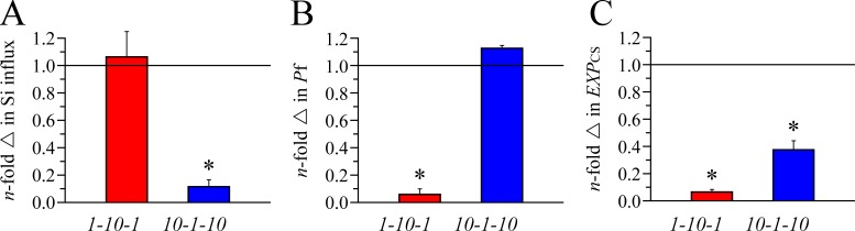Figure 4. Transport characteristics and membrane expression of AQP11-10-1 and AQP1010-1-10. (A) Si influx. Oocytes incubated in medium B2 for 90 min at room temperature were assayed for Si content. They were from 10 oocytes among three to four experiments. According to this presentation, a mean of 1 indicates no n-fold differences (Δ) in Si influx. (B) Water permeability. Oocytes incubated in plain water were assayed for volume measurements as described in Materials and methods. They were from three to five oocytes among three experiments. (A and B) Data are expressed as n-fold differences ± SE between AQP11-10-1 and AQP1 (left bar) or between AQP1010-1-10 and AQP10 (right bar) after background subtraction and normalization to channel expression levels. (C) AQP expression at the cell surface (EXPcs). Oocytes incubated in medium B2 for 90 min were lysed for Western blot analyses using specific anti-AQP Abs, and the signals obtained were quantified through densitometry. Data are expressed as n-fold differences ± SE between AQP11-10-1 and AQP1 (left bar) or between AQP1010-1-10 and AQP10 (right bar) after background subtraction. They were from three experiments. (A–C) The asterisk is used to indicate that the mean is significantly different statistically (*, P < 0.05) compared with the wild-type channel.
