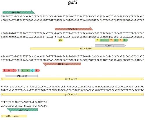 Figure 1—figure supplement 1. Map of the genomic sequences around the first coding exon of gdf3.Primers used to sequence genomic DNA flanking the TALEN target site are in green, HRMA primers are in brown and left (L) and right (R) TALENS are in grey. |