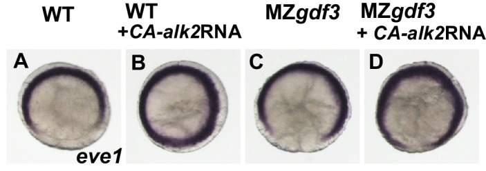 Figure 3—figure supplement 1. (A-D) The transcriptional repressor eve1 is expressed at the ventral and lateral margin at shield stage in WT and MZgdf3 embryos.Injection of 25 pg of CA-alk2 RNA into 1-2 cell WT or MZgdf3 embryos expands this expression domain onto the dorsal side. |