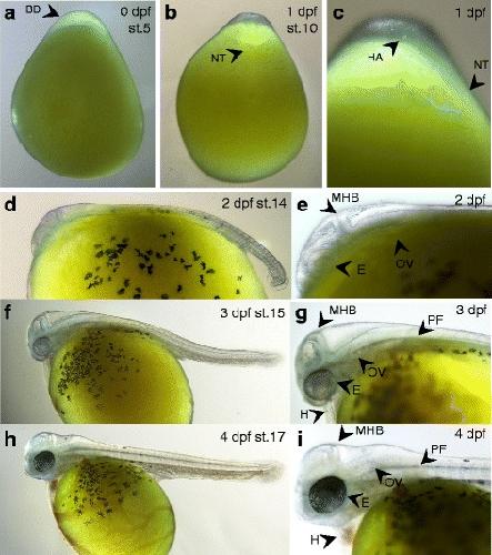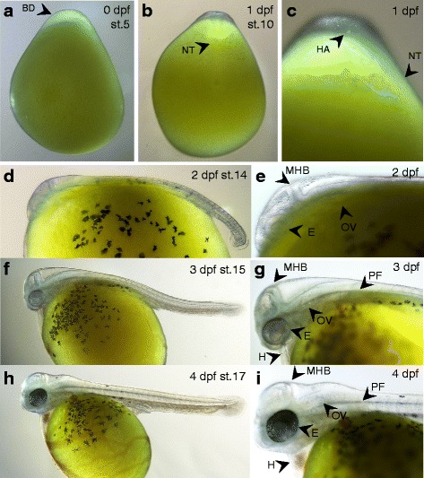 Fig. 2. Early embryonic development of A. burtoni. a On the day of fertilization (0 dpf) embryos develop until gastrulation – (shown is a blastula stage embryo, ~ stage 5). As in other teleosts, embryos develop on top of the yolk. b, c At 1 dpf, the neural tube and a head Anlage have formed (stage 10 shown). d, e By 2 dpf (stage 14), the embryos have developed pigmentation on the yolk, and a clear head can be distinguished, with presence of the mid-hindbrain boundary, otic vesicles and unpigmented eyes. At this stage, embryos are still surrounded by their chorion and the embryo shown has been manually dechorionated. f, g By 3 dpf (stage 15), the anterior-posterior axis has elongated further, pectoral fin Anlagen have appeared, and a clearly beating heart is visible. The eyes have developed light pigmentation. Also at this stage, embryos are still surrounded by their chorion, and the embryo shown has been manually dechorionated. h, i By 4 dpf (stage 17), the head has lifted up from the yolk, strong blood circulation through the heart is visible, and extensive vasculature runs across the yolk. All stages are indicated following the staging table for Nile tilapia [41]. Abbreviations: dpf: days post fertilization; st.: stage; BD: blastodisc; NT: neural tube; MHB: mid-hindbrain boundary; E: eye; OV: otic vesicle; PF: pectoral fin; H: heart; HA: Head Anlage |