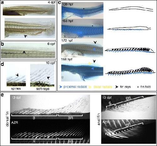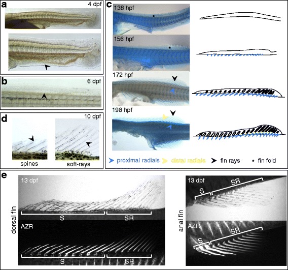 Fig. 6. Development of the anal and dorsal fins of A. burtoni. a The first dorsal and anal fin Anlagen are visible at hatching day (4 dpf) as a fin fold that is continuous with the caudal fin. In the anal fin fold, the domain of the final anal fin is recognizable by the lack of vascularization (black arrowhead in lower panel), which is restricted to the part of the fin fold that will degenerate. b At 6 dpf, mesenchymal condensations become visible proximally in the posterior dorsal and anal fins (indicated with a black arrowhead for the dorsal fin). These condensations correspond to tissue surrounding the forming fin radials (see transition from 138 hpf to 156 hpf in panel c). c Alcian blue staining shows the progression of dorsal and anal fin formation. At 138 hpf, a fin fold is present without detectable skeletal structures (asterisk). By 156 hpf, fin radials have formed (blue arrowhead), but no ray structures are apparent yet in the fin fold (asterisk). By 172 hpf, fin rays start forming (black arrowhead). The last elements to appear are the distal radials in between the proximal radials and the fin rays, and these appear around 198 hpf. d Initially, fin spines and soft-rays look very similar. By 10 dpf, their differentiation has progressed and clearly shows diverging developmental trajectories. Fin spines have developed a pointy ending, and segmentation is apparent in the soft-rays (black arrowheads). e At 13 dpf, ossification in the soft-rays and spines in dorsal and anal fins has progressed, and clearly demonstrates stronger ossification of the spines compared to soft rays. Upper panel shows bright-field view, lower panel shows fluorescent imaging for Alizarin red staining in the same specimen. Abbreviations: dpf: days post fertilization; hpf: hours post fertilization; AZR: Alizarin red; S: spines, SR: soft-rays |