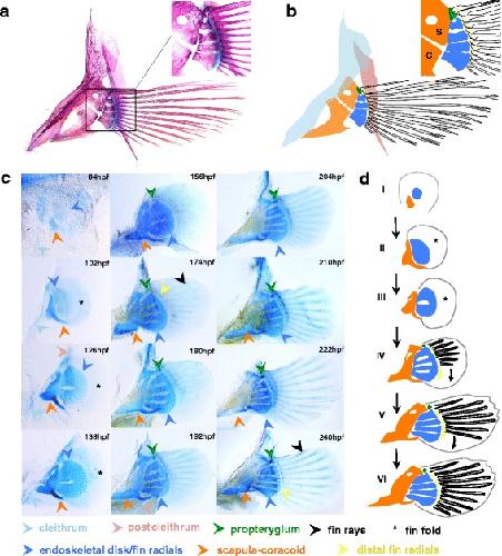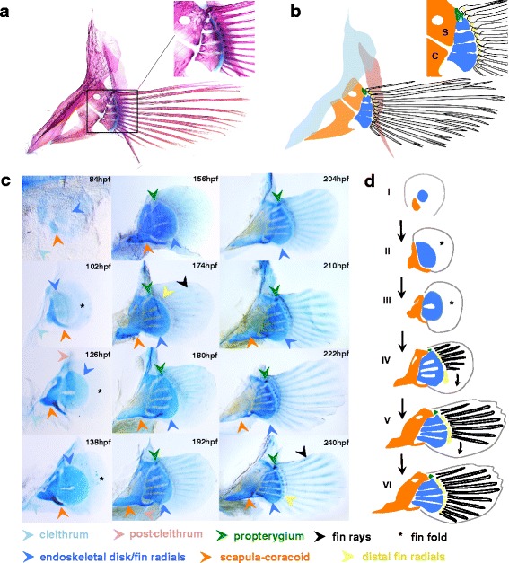 Fig. 7. Development of the pectoral fins and girdles of A. burtoni. a, b The pectoral girdles and fins of A. burtoni show the typical teleost anatomy. The girdle consists of two dermal bones, the cleithrum and the post-cleithrum, and two endochondral bones, the scapula and coracoid (indicated S and C in panel b). The pectoral fins consist of proximal radials that articulate via distal radials with the main external fin support, the dermal fin rays. The propterygium (see main text) is present as a separate radial during embryogenesis but is in the adult fused to the scapula. Shown is an Alizarin red/Alcian blue stained pectoral fin/girdle complex of an adult fish. c, d Alcian blue stained sequence of pectoral fin development (see main text for details). The cleithrum is indicated from 84 hpf to 138 hpf. Distal radials appear first at 174 hpf, and are present but not indicated in 180 hpf to 222 hpf. The post-cleithrum, which is only visible through its different contrast, is only indicated in 126 hpf and 192 hpf. Abbreviations: hpf: hours post fertilization; S: scapula; C: coracoid |