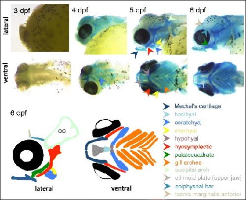 Fig. 12. Chondrification of the cranial skeleton in A. burtoni. Chondrified elements of the cranio-facial skeleton are detected using staining with Alcian blue. At 3 dpf, no chondrogenic differentiation of the craniofacial skeleton is yet detected At 4 dpf, the first elements corresponding to the pharyngeal skeleton become vissible and differentiate rapidly, so that at 5 dpf, the full complement of pharyngeal cartilages has formed. The schematic illustration of the chondrogenic cartilages present is for 6 dpf. Abbreviations: dpf: days post fertilization |