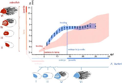 Fig. 14. Direct- versus indirect-development – A. burtoni versus zebrafish. The direct-development of A. burtoni (blue) is characterized by the completion of the body plan before the onset of feeding (embryo to larva transition at 14 dpf). This is reflected in a very homogenous progression of development, as has been described in this paper, and a very homogenous overall growth with only minor variation in standard length (Y-axis, data points included for 10 embryos/juveniles per day coming from different clutches). In comparison, zebrafish (red) develops only synchronously until the start of the embryo to larva transition, marked by the onset of feeding at 5 dpf. After this point, growth trajectories of individual fish strongly diverge (data range included from Parichi et al. 2009 [22], a very similar range was described in Grandel & Schulte-Merker 1998 [25]). The zebrafish' larva- to juvenile transition is indicated after references [4, 22]. When we consider the development of the pectoral fins for zebrafish (after [25]) and A. burtoni (this article), we see that in both species these follow very similar developmental trajectories (stages indicated after Fig. 7). In A. burtoni, pectoral fin formation is completed before 10 dpf, well before feeding stages, and differentiation occurs at a steady progression, and is predictable amongst individuals from the same clutch (developmental progression indicated along the X-axis in relation to time after fertilization). In zebrafish, pectoral fin formation starts similar with the formation of the endoskeletal disk (stage II). From the embryo to larva transition onward however, overall development slows down and growth becomes heterogeneous amongst similarly aged larvae. Therefore, time is not a good predictor of the progression of pectoral fin development, but standard length has to be used instead (pectoral fin stages indicated along the Y-axis in relation to standard length). Abbreviations: dpf: days post fertilization; SL: standard length |