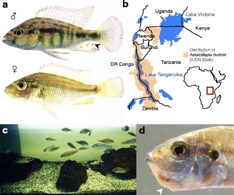 Fig. 1. Astatotilapia burtoni morphology, distribution and husbandry. a A. burtoni shows pronounced sexual dimorphism, with colorful dominant males with their characteristic egg spots on the anal fin (black arrowhead), and plain females. b A. burtoni is native to Lake Tangayika in the East African Rift Valley, with additional, introduced populations western of Lake Victoria (distribution after IUCN 2006, geographical boundaries drawn after Google earth 2017). c Typical tank set up for A. burtoni to house a breeding group of 20–40 adult fish. Aquaria do not need to be planted but are best decorated with gravel and numerous rocks and hiding places, such as upturned half-flowerpots, which the fish will use during their mating rituals. d Mouthbrooding females can be recognized by their expanded lower jaw, leading to a pronounced “chin” in profile view (white arrowhead) |