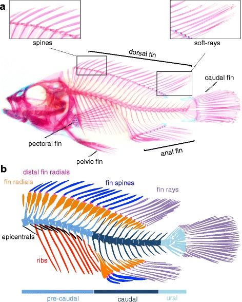 Fig. 4. Osteology of the axial and median fin skeleton of A. burtoni. a, b Alizarin red/Alcian blue stained and cleared skeleton of an adult fish shows a typical teleost skeleton, consisting of a spinal column with associated elements, and pectoral, pelvic, dorsal, anal and caudal fins. The axial skeleton consists of pre-caudal, caudal and ural regions. Vertebral centra and associated arches and spines are drawn as fused units. Two anterior ribless vertebrae followed by around 10 rib-bearing vertebrae form the pre-caudal region. The caudal region consists of around 12 ribless vertebrae. The vertebral column terminates posteriorly in the ural region, which consists of highly modified vertebral elements and arches supporting the caudal fin rays. Other accessory elements present to the vertebrae are the epicentrals, also known as dorsal ribs (see main text), which are membrane bones without homologs in tetrapods. In panel a note the presence of the pelvic fins on the anterior abdomen at the same anterior-posterior level as he pectoral fins. Dorsal and anal fins consist of an anterior domain containing fin spines and a posterior domain with soft fin rays, each shown for the dorsal fin in a zoom-box in panel a |