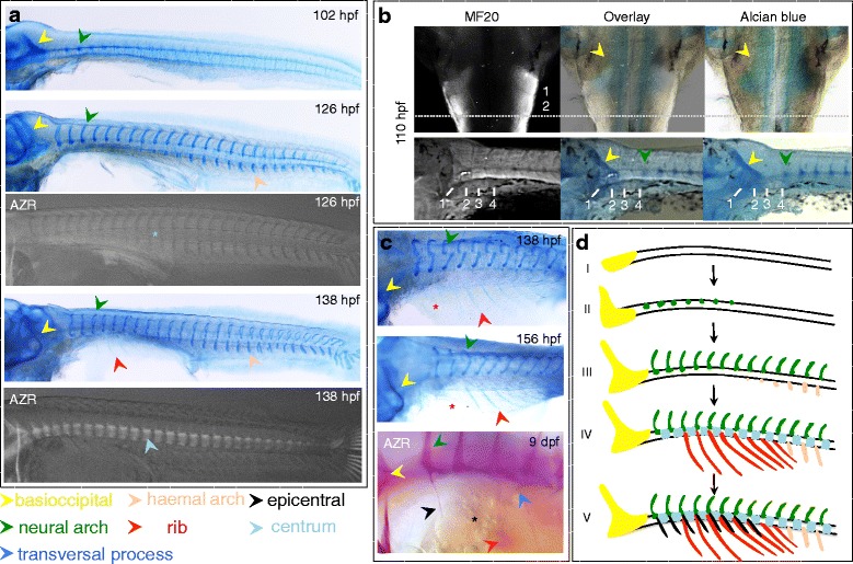 Fig. 5. Development of the axial skeleton of A. burtoni. a Neural and haemal arches develop between 102 hpf and 126 hpf, as shown by Alcian blue staining. In teleost fish, vertebral centra do not form through a cartilaginous intermediate, and ossified centra become first visible by Alizarin red staining (fluorescent microscopy image) at 138 hpf. Blue asterisk in 126 hpf indicates absence of mineralized centra. b Visualization of somites, using the muscle sarcomere specific antibody MF20 together with Alcian blue staining, shows that the basioccipital (yellow arrowhead) has formed by 100 hpf within somites 1 and 2, and extends up to the somite 2â3 boundary. The first developing neural arch is present in somite 4. This shows that, as in other anamniotes, the basioccipital develops from the first three somites. The horizontal dotted line indicates the somite 2â3 boundary. c Ribs develop around 138 hpf (red arrowhead). Interestingly, we observe what appear to be rib Anlagen associated with pre-caudal vertebrae 1 and 2 (indicated with a red asterisk), which in the adult skeleton are not rib-bearing. At 156 hpf, these âcrypticâ ribs are however no longer present (indicated with a red asterisk). Epicentrals develop much later and only start developing around 9 dpf as membrane bones (black arrowhead indicates epicentral on pre-caudal vertebra 1; the black asterisk indicates the forming epicentral on pre-caudal vertebra 2; the blue arrowhead indicates a transversal process on pre-caudal vertebra 4, which is not further discussed here). d The axial skeleton forms in the following sequence: the first element to appear is the basioccipital (stage I, before 100 hpf), followed by the formation of neural and haemal arches dorsal and ventral of the notochord (stage II and III). Further elements to appear are the vertebral centra and the ribs (stage IV), followed by the epicentrals (stage V). Abbreviations: dpf: days post fertilization; hpf: hours post fertilization; AZR: Alizarin red |