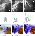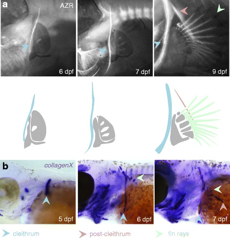 Fig. 8. Development of the pectoral girdle of A. burtoni. a Visualization of ossification by fluorescent imaging of Alizarin red stained embryos. At 6 dpf and 7 dpf, only the cleithrum has ossified, followed by the fin rays and the post-cleithrum at 9 dpf. Embryos shown were also stained for Alcian blue, which in the fluorescent images shows cartilaginous elements as a dark counterstain. In the drawing these unossified endoskeletal girdle and fin elements are indicated in grey. Cb In situ hybridization for collagenX visualizes the ossifying dermal bones in the same sequence but approximately one day in advance of the mineralization process as detected by Alizarin red staining. Abbreviations: dpf: days post fertilization; AZR: Alizarin red |