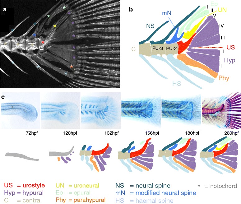 Fig. 10. Development of the caudal fin of A. burtoni. a, b Osteology of the adult caudal fin of A. burtoni as detected by Alizarin red staining (fluorescence image in panel a. A. burtoni has a typical acanthomorph caudal fin consisting of five hypurals (I-V), a parahypural, two epurals (I, II), a urostyle, and two haemal and neural spines, contributing to the support of the dermal fin rays. Note the highly modified neural spine on the second pre-ural centrum (PU-2) that forms a complex articulation with the first epural. c Alcian blue staining shows that the first elements to appear are the hypurals and parahypural aroud 120 hpf. This is followed by the appearance of the haemal and neural arches on pre-ural centra 2 and 3 around 132 hpf. The epurals appear later, between 156 hpf and 180 hpf. By 260 hpf (Alcian blue/Alizarin red double stain), the uroneural has developed as a directly ossifying membrane bone. The developing notochord is indicated using a grey asterisk in the 72 hpf specimen. Abbreviations (except those explained at the bottom of the figure): hpf: hours post fertilization |