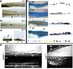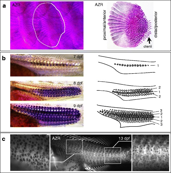Fig. 11. Scale development in A. burtoni. a Adult scales stained using Alizarin red. Scales are present in an organized arrangement, whereby their proximal-distal axis is aligned anterior-posteriorly along the trunk. Proximally, scales are overlapped by the distal part of their anterior/lateral neighboring scale(s). In the left panel, the outline of one scale is drawn using a dotted line for the proximal part that is covered by the flanking scales. In the right panel, a close up of a single scale is shown. The scales consist of concentric rings of bone, and spike elements distally, the ctenii. The scales attach to the body through their proximal end. b During development, scale Anlagen are first detected at 7 dpf, using in situ hybridization with the ossification marker collagenX, as a single row along the posterior midline (indicated “1” in the drawing to the right). At 8 dpf, one more row dorsally and one more row ventrally have appeared (indicated “2” in the drawing to the right), while the initial row has expanded anteriorly. At 9 dpf, this process has been repeated with the appearance of an additional dorsal and ventral row of scales (indicated “3” in the drawing to the right). c At 13 dpf, bone mineralization in the scales is present along the posterior trunk where they were first formed (zoom-in right panel), while more anteriorly, mineralization is still absent or less pronounced. Shown is a fluorescence image of an Alizarin red stained specimen. Abbreviations: AZR: Alizarin red; dpf: days post fertilization |