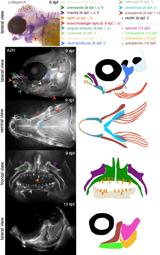 Fig. 13. Ossification of the cranio-facial skeleton in A. burtoni. At 6 dpf, ongoing ossification can be detected in the craniofacial skeleton using in situ hybridization with collagenX. This clearly visualizes the formation of the branchiostegal rays (red arrowhead), which form without a cartilage intermediate (compare 6 dpf in Fig. 12). At 9 dpf, most of the adult bones of the cranio-facial skeleton have started ossification, as shown by Alizarin red staining (fluorescence microscopy images shown), and the formation of teeth has started (orange arrowhead). Full formation of the complete opercular series (opercle, infraopercle, subopercle and preopercle) is shown for a 13 dpf specimen. Note that many bones in the skull form without a cartilaginous intermediate. Therefore, there is no one to one correspondence between the chondrogenic elements in Fig. 12 and the ossifying elements in Fig. 13. The legend in the figure indicates for which specimen each anatomical element is indicated. Abbreviations: l: lateral view; v: ventral view; f: frontal view; dpf: days post fertilization |