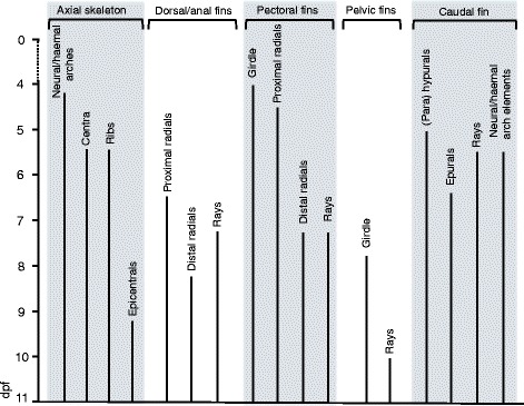 Fig. 15. Overview of the sequence of development of the post-cranial skeleton of A. burtoni. Schematic representation of the development of the various morphological aspects described for the axial skeleton as well as the pectoral, pelvic, dorsal/anal and caudal fins, with the anatomical structures aligned along the X-axis and their development shown according to time (dpf) on the Y-axis. No timeline for craniofacial elements is included. Abbreviations: dpf: days post fertilization |
