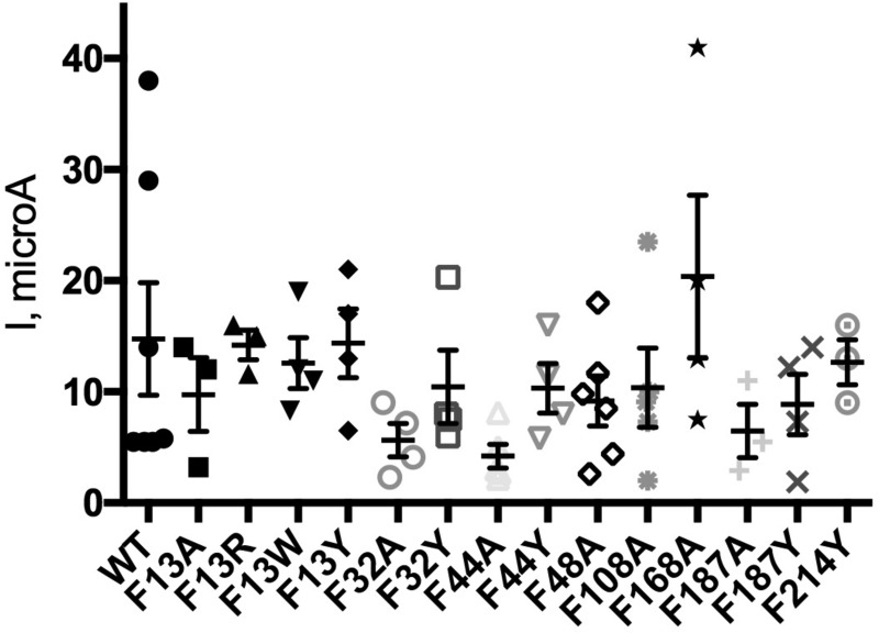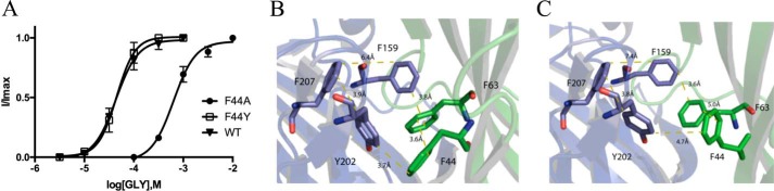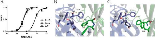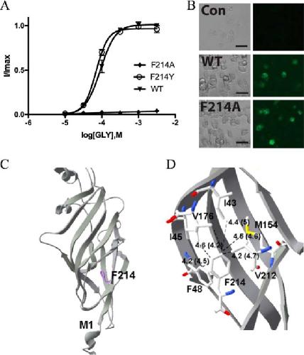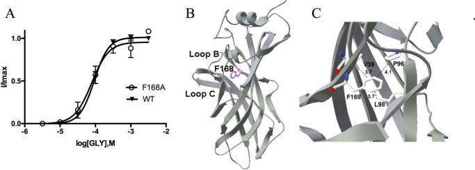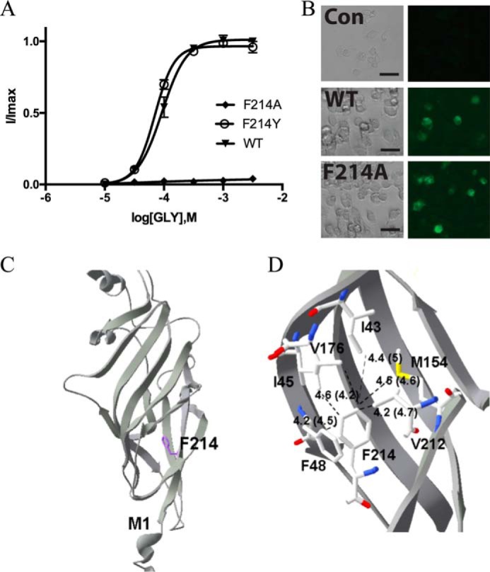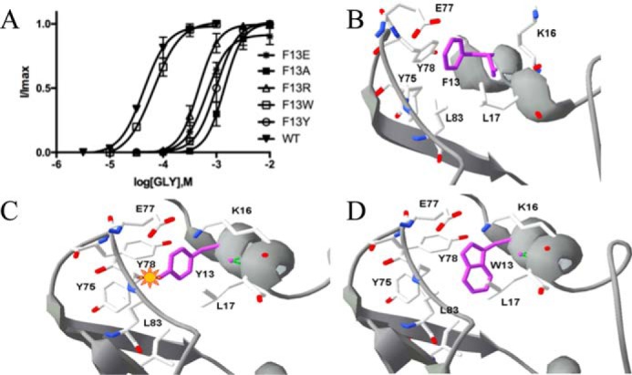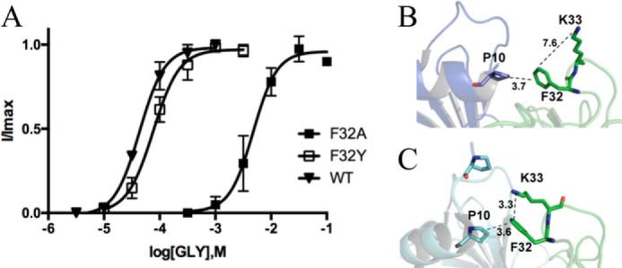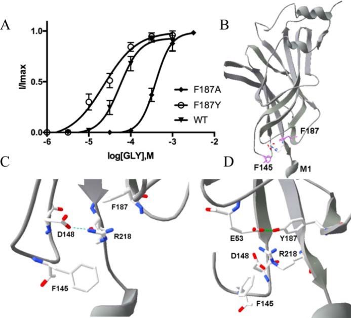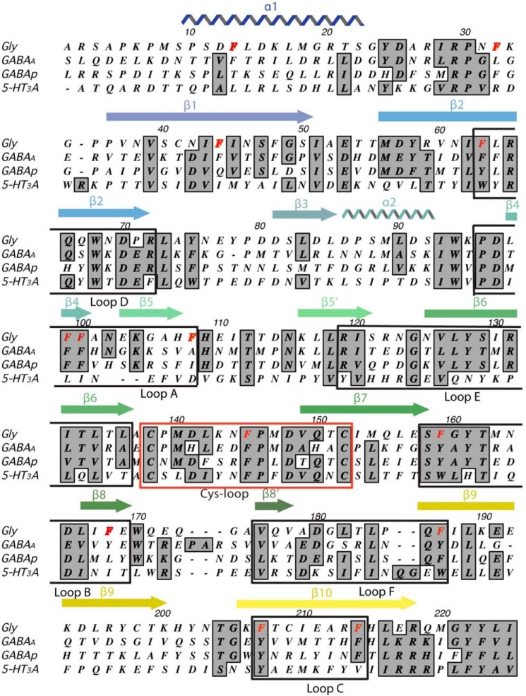 Glycine receptors (GlyRs) are Cys-loop receptors that mediate fast synaptic inhibition in the brain stem and spinal cord. They are involved in the generation of motor rhythm, reflex circuit coordination, and sensory signal processing and therefore represent targets for therapeutic interventions. The extracellular domains (ECDs) of Cys-loop receptors typically contain many aromatic amino acids, but only those in the receptor binding pocket have been extensively studied. Here, we show that many Phe residues in the ECD that are not located in the binding pocket are also involved in GlyR function. We examined these Phe residues by creating several GlyR variants, characterizing these variants with the two-electrode voltage clamp technique in Xenopus oocytes, and interpreting changes in receptor parameters by using currently available structural information on the open and closed states of the GlyR. Substitution of six of the eight Phe residues in the ECD with Ala resulted in loss of function or significantly increased the EC50 and also altered the maximal response to the partial GlyR agonist taurine compared with glycine in those receptor variants that were functional. Substitutions with other amino acids, combined with examination of nearby residues that could potentially interact with these Phe residues, suggested interactions that could be important for GlyR function, and possibly similar interactions could contribute to the function of other members of the Cys-loop receptor family. Overall, our results suggest that many ECD regions are important for GlyR function and that these regions could inform the design of therapeutic agents targeting GlyR activity.