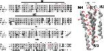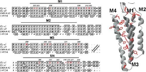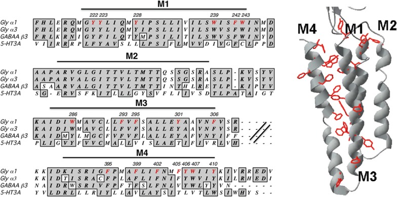Fig. 1. Alignment of the transmembrane domain of the GlyR α1 subunit with those from a range of other pLGIC subunits showing the aromatic residues examined in this study (in red), and the location of residues in the TMD of one of the 5 subunits that constitute the receptor, showing that many are located at the M1/M3/M4 interface