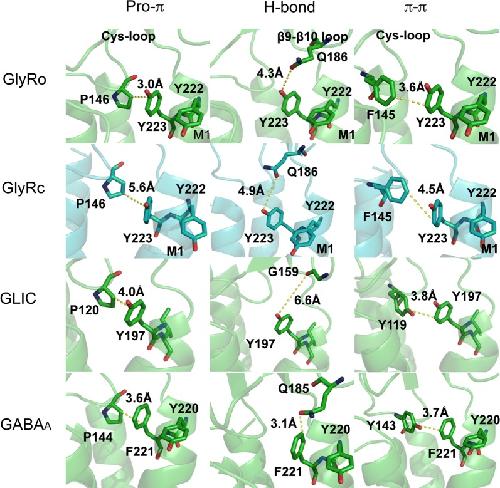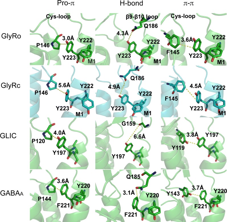 Fig. 4. Structures of Gly, GLIC and GABAA receptors showing possible interactions of Y222 and Y223 or equivalent residues. GlyRoâ=âGlyR in open state; GlyRcâ=âGlyR in closed state