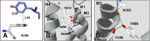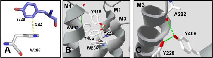 Fig. 5. A Y228 and W286 are well positioned to form a T-type π–π interaction; B These residues, with Y406,W407 and Y410, form an aromatic cluster at the top of the M1/M3/M4 interface. C Y406 could form a hydrogen bond (green dashes) with either A282 or Y228; the data better support the former