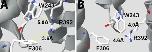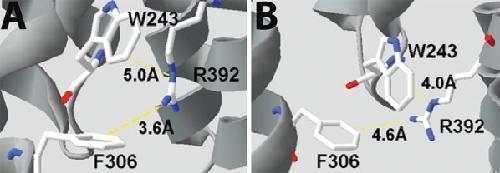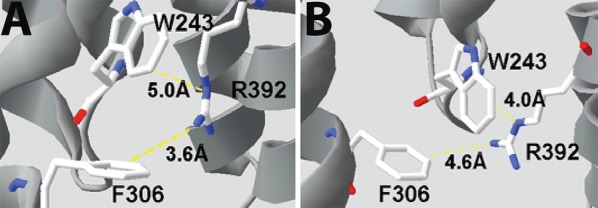 Fig. 9. F306 could form a cation–π interaction with R392 in the open state (A), but R392 is more likely to do this with W243 in the closed state (B)