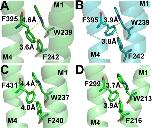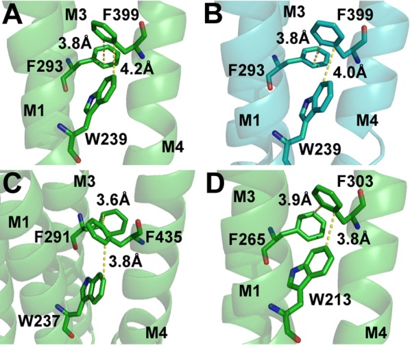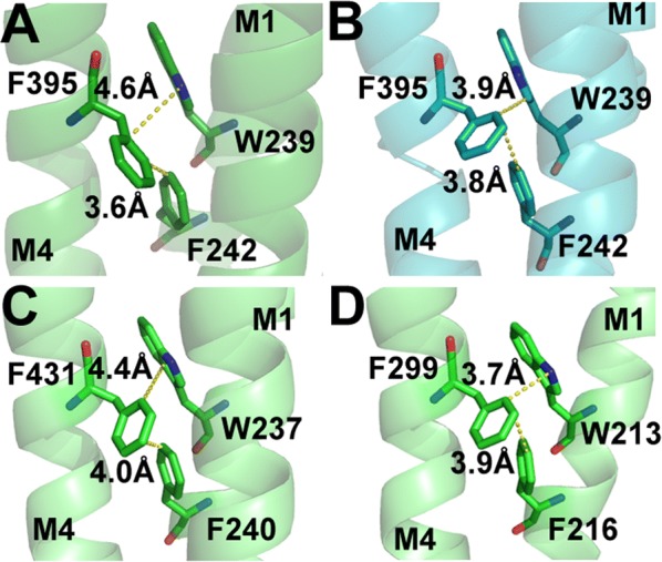 Fig. 7. Distances between W239 and F395 differ in the open (A) and closed (B) states, although those between F395 and F242 do not. Structural data show equivalent residue interactions in this region are possible in the GABAA receptor (C) and GLIC (D)