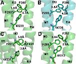 Fig. 6. GlyR in the open (A) and closed (B) states show similar interactions between W239, F293 and F399. Structural data show equivalent residue interactions are possible in the GABAA receptor (C) and GLIC (D)