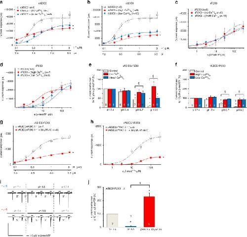 Fig. 4. Changes in the Ca2+ concentration modify rASIC3 and rP2X3R currents in CHO cells. Whole-cell patch-clamp recordings at a holding potential of −65 mV. a, b Concentration–response curves for protons in CHO cells transfected with rASIC3. a Inhibitory effect of an increase or decrease of the Ca2+ concentration in the external medium ([Ca2+]o). b Inhibitory effect of an increase or decrease of the free Ca2+ concentration in the patch pipette solution ([Ca2+]i). c, d Concentration-response curves for α,β-meATP in CHO cells transfected with rP2X3. c No effect of changes in [Ca2+]o. d No effect of changes in [Ca2+]i. Means ± S.E.M. of the indicated number of experiments. *P < 0.05; statistically significant difference of the Imean values at the highest agonist concentration (one-way ANOVA followed by the Holm–Sidak test). e, f CHO cells transfected with both rASIC3 and rP2X3 in a 1:1 ratio. Modulation of the unilateral interaction between rASIC3 and rP2X3Rs, by changes in [Ca2+]o (e) and [Ca2+]i (f); the experimental protocol is identical to that shown in Fig. 2a. *P < 0.05; statistically significant difference from the current amplitudes measured in normal extra- and intracellular Ca2+. §P < 0.05; statistically significant difference between currents at pH 6.7 or 6.5 at different Ca2+ concentrations (one-way ANOVA followed by the Bonferroni test). Concentration–response relationships for protons (g) and α,β-meATP (h) in CHO-rASIC3/rP2X3R cells, in the absence and presence of J-8 (30 µM). Means ± S.E.M. of the indicated number of experiments. *P < 0.05; statistically significant difference between the Imean values at the highest agonist concentration (Student’s t-test). i Potentiation of the α,β-meATP (30 µM) current by co-application with a J-8 (30 µM)-containing, low pH (6.5) external medium, but inhibition in the absence of J-8 by acidification; representative tracings. j Percentage changes of α,β-meATP-induced current responses were calculated with respect to the second current amplitude before the pH shift. Means ± S.E.M. of the indicated number of experiments. *P < 0.05; statistically significant difference between the current amplitudes before and after the pH shift from 7.4 to 6.5 in the presence of J-8. §P < 0.05; statistically significant difference between current amplitudes at pH 6.5 in the presence or absence of J-8 (Mann–Whitney test). The scale labels for the vertical and horizontal bars in (i) were 1 nA and 50 s, respectively |