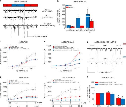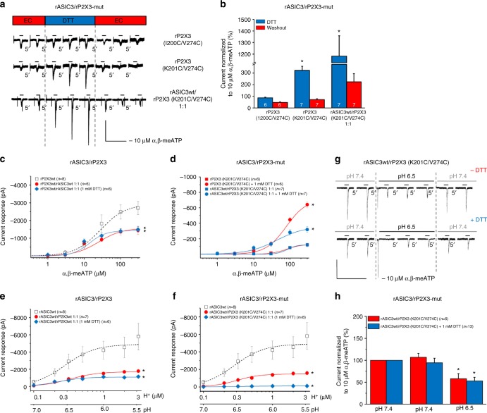 Fig. 6. Effects of gate-inhibitory mutations in rP2X3Rs on rASIC3/rP2X3R function. Whole-cell patch-clamp recordings at a holding potential of −65 mV. a, b Analysis of rP2X3 double cysteine mutants with disulfide trapping. CHO cells were transfected with the cysteine mutants rP2X3 (I200C/V274C), rP2X3 (K201C/V274C) or co-transfected with rASIC3wt and rP2X3 (K201C/V274C) in a 1:1 ratio. a Current traces induced by α,β-meATP (10 µM) applied repeatedly for 2 s with 5 min intervals before, during and after the co-application of ditiothreitol (DTT; 1 mM). b Percentage changes of α,β-meATP-induced current responses were calculated with respect to the mean of the second and third currents during DTT application. Means ± S.E.M. of the indicated number of experiments. *P < 0.05; statistically significant difference between the current amplitudes during and after DTT application (Student’s t-test). c–f Concentration–response curves for protons and α,β-meATP in CHO cells co-transfected with the indicated receptors. c Effect of α,β-meATP (0.3–300 µM) on rP2X3Rwt, and rASIC3wt/rP2X3Rwt in the absence or presence of DTT. d Effect of α,β-meATP on rP2X3R (K201C/V274C) and rASIC3/rP2X3R (K201C/V274C) in the absence or presence of DTT. e Effect of protons (pH 7.0–5.5) on rASIC3wt and rASIC3wt/rP2X3Rwt in the absence or presence of DTT. f Effect of protons (pH 7.0–5.5) on rASIC3wt and rASIC3wt/rP2X3R (K201C/V274C) in the absence or presence of DTT. Means ± S.E.M. of the indicated number of experiments. *P < 0.05; statistically significant difference of the Imean values at the highest agonist concentration from the rP2X3Rwt and rASIC3wt curves, respectively (one-way ANOVA followed by the Holm–Sidak test). g Interaction between rASIC3wt and rP2X3R (K201C/V274C) in the absence and presence of DTT. Currents were elicited by α,β-meATP (10 µM) for 2 s with 5 min intervals before, during and after the pH shift from 7.4 to 6.5. h Percentage changes of α,β-meATP-induced current responses were calculated with respect to the second current before the pH shift. Means ± S.E.M. of the indicated number of experiments. *P < 0.05; statistically significant difference between the current amplitudes before and after the pH shift from 7.4 to 6.5 (Student’s t-test). The scale labels for the vertical bars were 200 pA (a, g). The scale labels for the horizontal bars were 20 s (a) and 50 s (g) |