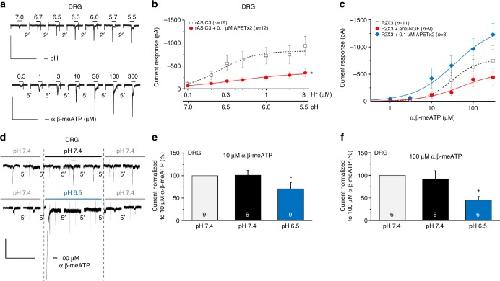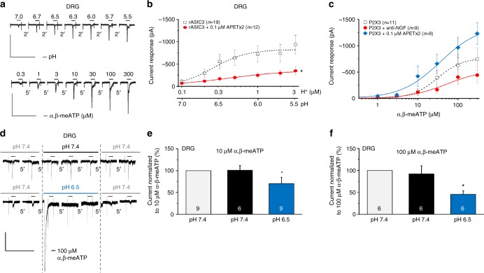 Fig. 7. Electrophysiological interaction of native ASIC3 and P2X3Rs in rat DRG neurons. Whole-cell patch-clamp recordings at a holding potential of â65âmV. Rat cultured DRG neurons were used in all panels. Increasing concentrations of protons (pH 7.0â5.5) (a, upper panel) or α,β-meATP (0.3â300âµM) (a, lower panel) were applied in the presence of 10âµM capsazepine for 2âs with 2âmin or 5âmin intervals, respectively. DRG neurons were treated with APETx2 (0.1âµM; b, c) or anti-NGF (6âµg/ml for 24âh; c) while constructing concentrationâresponse curves for protons or α,β-meATP. Meansâ±âS.E.M. of the indicated number of experiments. *Pâ<â0.05; statistically significant difference between the Imean values at the highest agonist concentrations (one-way ANOVA followed by the HomâSidak test). d Current responses were elicited by repeated applications of α,β-meATP (10âµM) for 2âs with 5âmin intervals before, during and after the pH shift from 7.4 to 6.5; representative tracings. The peak of the proton-induced current was retouched in the lower panel of (d). Percentage changes of α,β-meATP-induced current responses at 10âµM (e) or 100âµM (f) were calculated with respect to the second current amplitude before the pH shift from 7.4 to 6.5. Meansâ±âS.E.M. of the indicated number of experiments. *Pâ<â0.05; statistically significant difference between the current amplitudes before and after the pH shift from 7.4 to 6.5 (one-way ANOVA followed by the Bonferroni test). The scale labels for the vertical bars were 500âpA (a) and 200âpA (b). The scale labels for the horizontal bars were 20âs (a) and 50âs (d) |