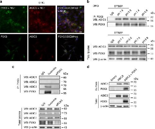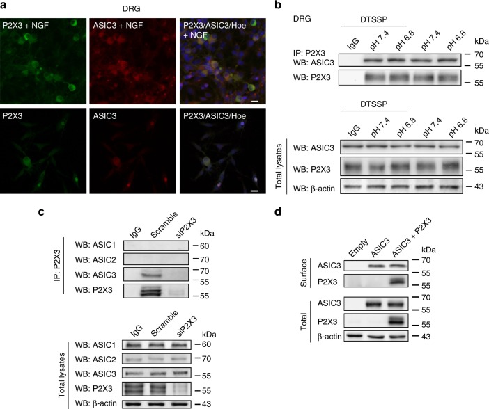 Fig. 8. Immunoreactivity, co-immunoprecipitation and membrane expression of rASIC3 and rP2X3Rs in rat DRG neurons. a ASIC3 and P2X3R immunoreactivities in rat DRG neurons cultured in the presence (upper panel) or absence (lower panel) of nerve growth factor (NGF). Hoechst (Hoe) was used to stain the cell nuclei. b Examples of immunoprecipitation (IP) of DTSSP-treated extracts of primary sensory neurons with P2X3 antibodies revealed in western blots (WB) with anti-ASIC3 antibodies. Incubation of neuronal cultures at pH 6.8 or 7.5 has no effect. ASIC3 signal is not found after immunoprecipitation with unrelated antibodies (IgG). Input ASIC3 and P2X3 contents in total extracts are also shown. β-Actin is used as gel loading control. c Examples of immunoprecipitation of P2X3 receptors (P2X3, upper panel) with ASIC3 channels in control conditions (scramble) and after P2X3 receptor silencing (siP2X3). No P2X3/ASIC3 signal was found after siP2X3 treatment. Western blot with anti-ASIC1 or anti-ASIC2 antibodies gave no signal. Pull down with unrelated antibody (IgG) gave no signal. Quality of input lysates and equal gel loading is shown (lower panel, total lysates). d Surface expression of P2X3Rs. Example of membrane protein biotinylation experiments in CHO cells transfected with plasmids encoding for ASIC3 alone or ASIC3 plus P2X3Rs (upper panel, surface). Quality of total protein extracts and controls for equal gel loading are also shown (bottom panel, total lysates). The scale labels in the right upper and lower panels of (a) were 20âµm |