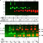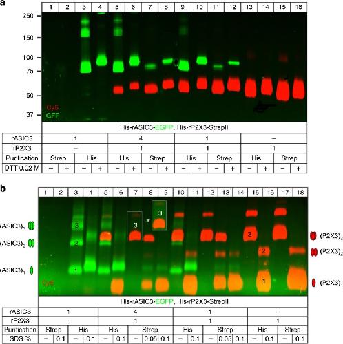 Fig. 9. Plasma membrane expression and oligomeric assembly of rASIC3 and rP2X3R subunits in oocytes. For biochemical analysis, Xenopus (X.) laevis oocytes expressing the indicated proteins were surface labeled with the membrane-impermeant fluorescent Cy5 dye before protein purification. The indicated proteins were purified under non-denaturing conditions from X. laevis oocytes by Ni2+-NTA chromatography or Strep-Tactin chromatography, as indicated, resolved by SDS-PAGE (a) or BN-PAGE (b), and visualized by Typhoon fluorescence scanning. a Overlay of the Cy5-labeled surface form (red) of the His-rASIC3-EGFP and His-rP2X3-StrepII protomers and the GFP fluorescence (green) of the His-rASIC3-EGFP protomer. The positions of molecular mass markers (in kDa) are shown on the left. b Overlay of GFP and Cy5 fluorescence of the homomeric His-rASIC3-EGFP (lanes 1â4) and homotrimeric His-rP2X3-StrepII (lanes 15â18) and the co-expressed His-rASIC3-EGFP and His-rP2X3-StrepII receptor subunits (lanes 5â14) in their native or partial SDS-denatured forms isolated by Ni2+-NTA (lanes 3â6, 10, 11, 15, 16) or Strep-Tactin (lanes 7â9, 12â14, 17, 18) chromatography as indicated. Co-expression of rASIC3 and rP2X3 (lanes 5â14) originates from the co-injection of the His-rASIC3-EGFP and His-rP2X3-StrepII subunit in cRNA ratios as indicated. The number of protomers included in the respective bands are exemplarily indicated. The inset shows the indicated section of the gel with enhanced GFP fluorescence to enable the visibility of the ASIC3 trimer. The schematics and labeling on the left or right margins indicate the numbers of rASIC3 or rP2X3 protomers incorporated in the respective trimeric (bold) or dimeric or monomeric protein band of the rASIC3 or rP2X3 receptor complexes, respectively |