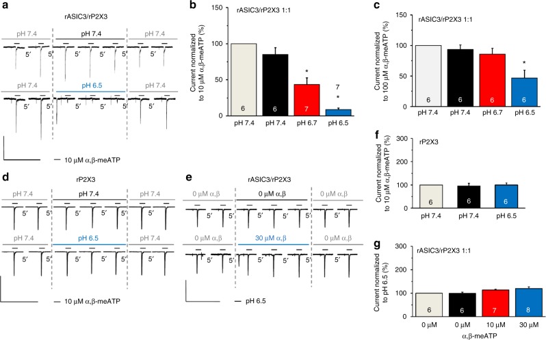 Fig. 2. Interaction between rASIC3 and rP2X3Rs after their transfection into CHO cells. CHO cells were transfected with rASIC3 and rP2X3Rs in a 1:1 ratio or transfected only with rP2X3R as indicated. Whole-cell patch-clamp recordings at a holding potential of −65 mV. a–c Interaction between rASIC3 and rP2X3Rs on their sequential activation by agonists. Current responses were elicited by α,β-meATP (10 or 100 µM) for 2 s with 5 min intervals before, during and after a shift in pH from 7.4 to 6.7 or 6.5. The reproducibility of the responses to α,β-meATP after changing to a solution with the same pH of 7.4 is also shown. d, f No effect of protons on rP2X3Rs. Current responses were elicited by α,β-meATP (10 µM) for 2 s with 5 min intervals before, during and after a shift in pH from 7.4 to 6.5. e, g No effect of α,β-meATP (10 and 30 µM) on the proton-induced inward current on the sequential activation of rP2X3 and rASIC3Rs. Stable responses to pH 6.5 in the absence of α,β-meATP is also shown. Percentage changes of α,β-meATP (10 and 100 µM)-induced current responses were calculated with respect to the second current before the pH shift to 6.7 or 6.5 (b, c, f). Percentage changes of proton (pH 6.5)-induced current responses were calculated with respect to the second current amplitude before the application of α,β-meATP (0, 10 and 30 µM) (g). Means ± S.E.M. of the indicated number of experiments. *P < 0.05; statistically significant difference between the current amplitudes before and after the long-lasting shift in pH or the long-lasting presence of α,β-meATP (one-way ANOVA followed by the Bonferroni test). The scale labels for the vertical bars were 500 pA (a) and 2 nA (d, e). The scale labels for the horizontal bars were 50 s (a, d, e) |