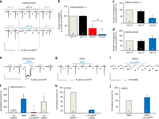 Fig. 3. Interaction between various ASICs and P2X3Rs after their transfection into CHO cells. CHO cells were transfected with various ASICs and P2X3Rs in a 1:1 ratio or transfected only with rP2X3R or rASIC3, as indicated. Whole-cell patch-clamp recordings at a holding potential of −65 mV. a, b Interaction between hASIC3 and hP2X3Rs on their simultaneous activation. Interaction between rASIC1a (c) or rASIC2a (d) with rP2X3Rs on their simultaneous activation. The drug application and evaluation protocols were like those used in Fig. 2a–g. Means ± S.E.M. of the indicated number of experiments. *P < 0.05; statistically significant difference between the current amplitudes before and after the shift in pH. §P < 0.05; statistically significant difference between the pH-induced inhibition of the current amplitudes at pH 4.0 and 3.5 (one-way ANOVA followed by the Bonferroni test in both cases). e Current responses were elicited in CHO-rASIC3/rP2X3R cells by α,β-meATP (10 µM) before, during and after the application of GMQ. f Means ± S.E.M. percentage changes of the α,β-meATP-induced current responses were calculated with respect to the second current amplitude before GMQ application. g Inhibition of current responses to α,β-meATP in CHO-rP2X3R cells. h Means ± S.E.M. percentage inhibition in the indicated number of experiments as shown in (g). i No change of the GMQ (1 mM)-induced current in the presence of α,β-meATP (10 µM) in CHO-rASIC3 cells. j Means ± S.E.M. percentage change in the indicated number of experiments as shown in (i). *P < 0.05; statistically significant difference from the α,β-meATP-induced current amplitudes before GMQ application (one-way ANOVA followed by the Bonferroni or Mann–Whitney test, as appropriate). The scale labels for the vertical bars were 2 nA (a, g, i) and 1 nA (e). The scale labels for the horizontal bars were 50 s (a, e, g, i) |