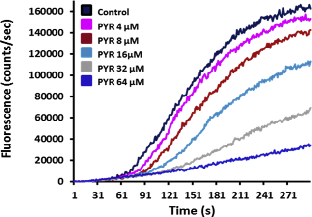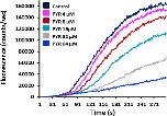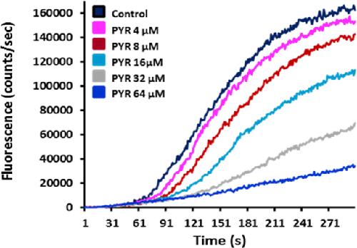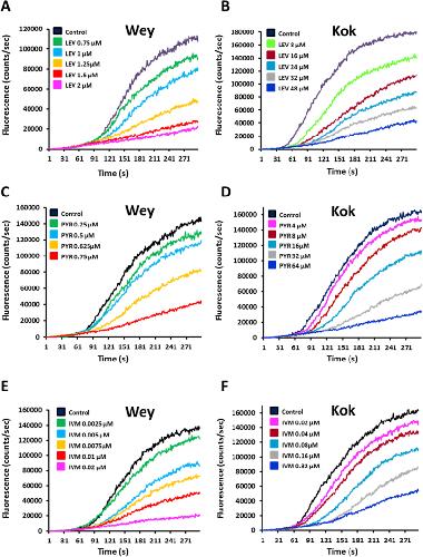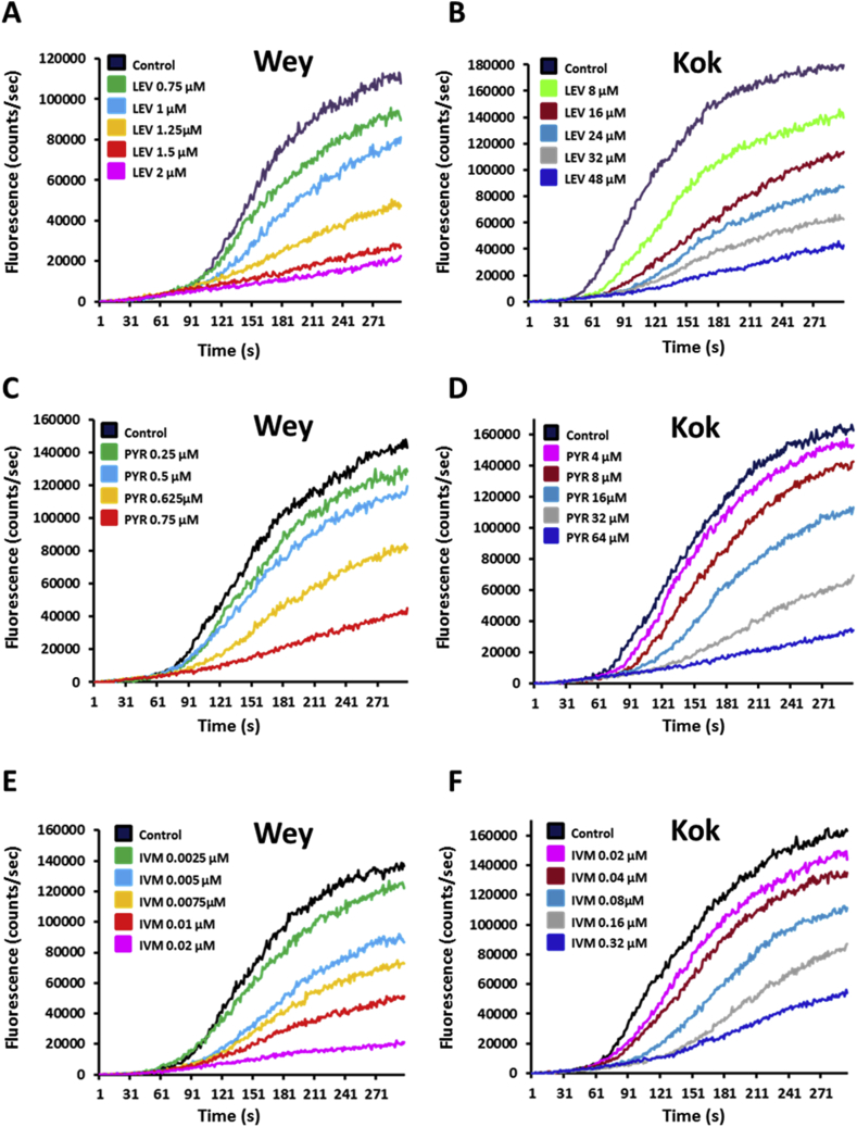 Fig. 1. Motility modulation of H. contortus L3 larvae exposed to levamisole, pyrantel or ivermectin. The automated larval migration assay (ALMA) was used to determine dose-dependent paralysis effect of Lev, Pyr or Ivm on the H. contortus L3 from Weybridge (A; C and E) or Kokstad isolate (B; D and F). Representative recording traces of the real-time fluorescence counting relative to the L3 migration during 5 min exposed to Lev (A and B); Pyr (C and D) or Ivm (E and F). Each trace corresponds to the mean data from 3 runs performed with 7500 L3 larvae. The controls correspond to untreated L3 larvae.