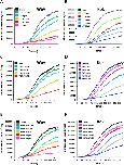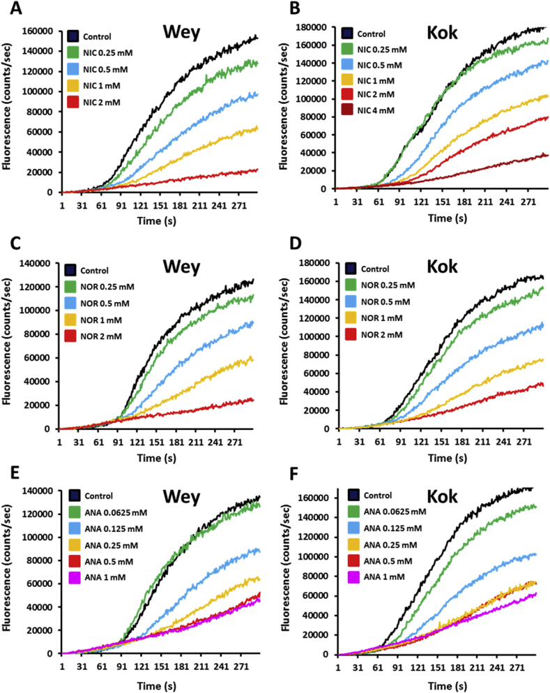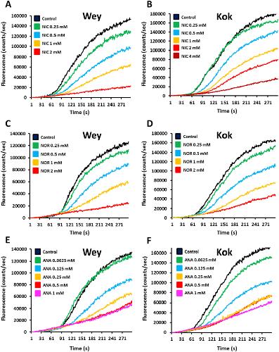 Fig. 2. Motility modulation of H. contortus L3 larvae exposed to nicotine, nornicotine or anabasine. The automated larval migration assay (ALMA) was used to determine dose-dependent paralysis effect of Nic, Nor or Ana on the H. contortus L3 from Weybridge (A; C and E) or Kokstad isolate (B; D and F). Representative recording traces of the real-time fluorescence counting relative to the L3 migration during 5 min exposed to Nic (A and B); Nor (C and D) or Ana (E and F). Each trace corresponds to the mean data from 3 runs performed with 7500 L3 larvae. The controls correspond to untreated L3 larvae.